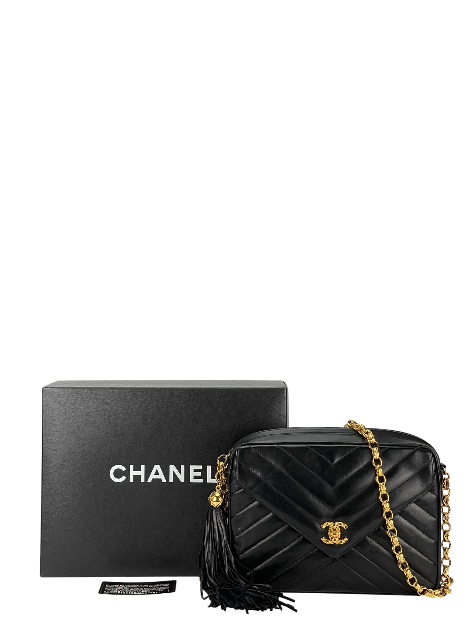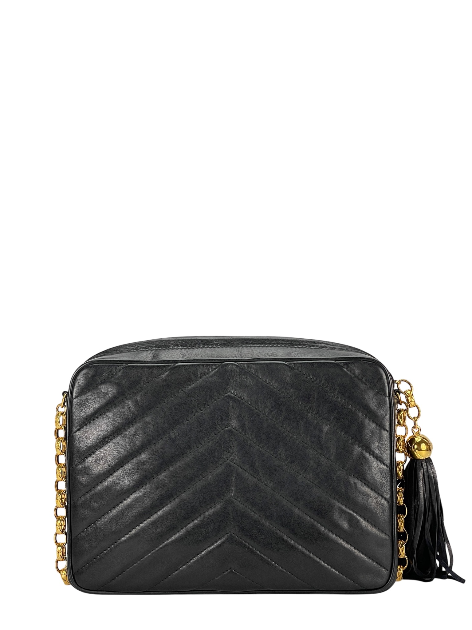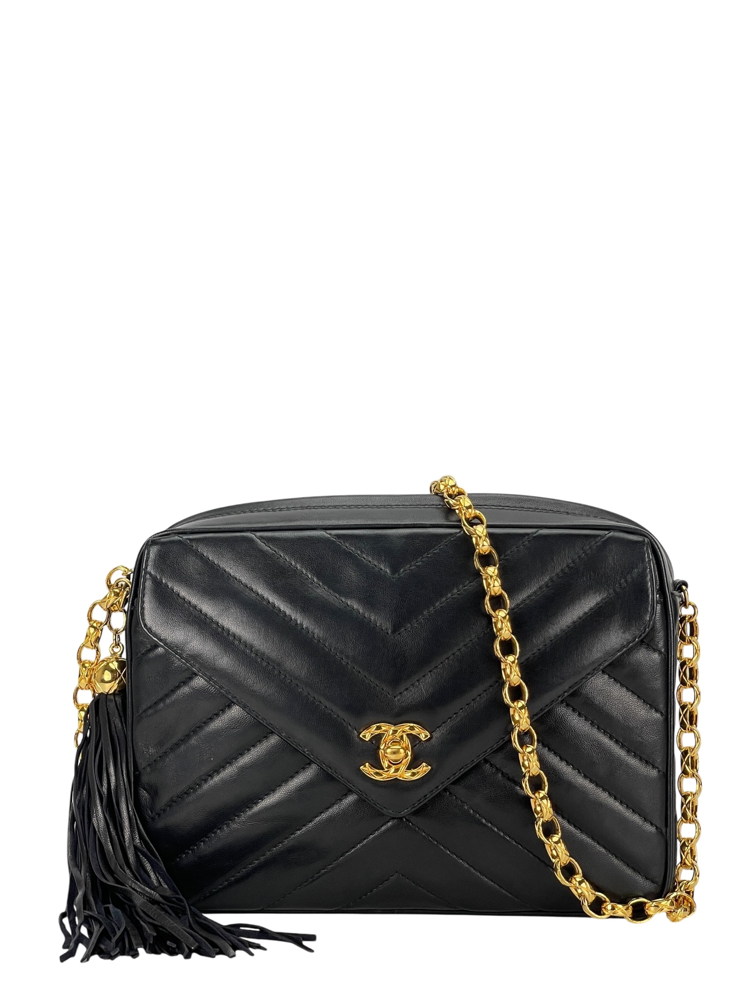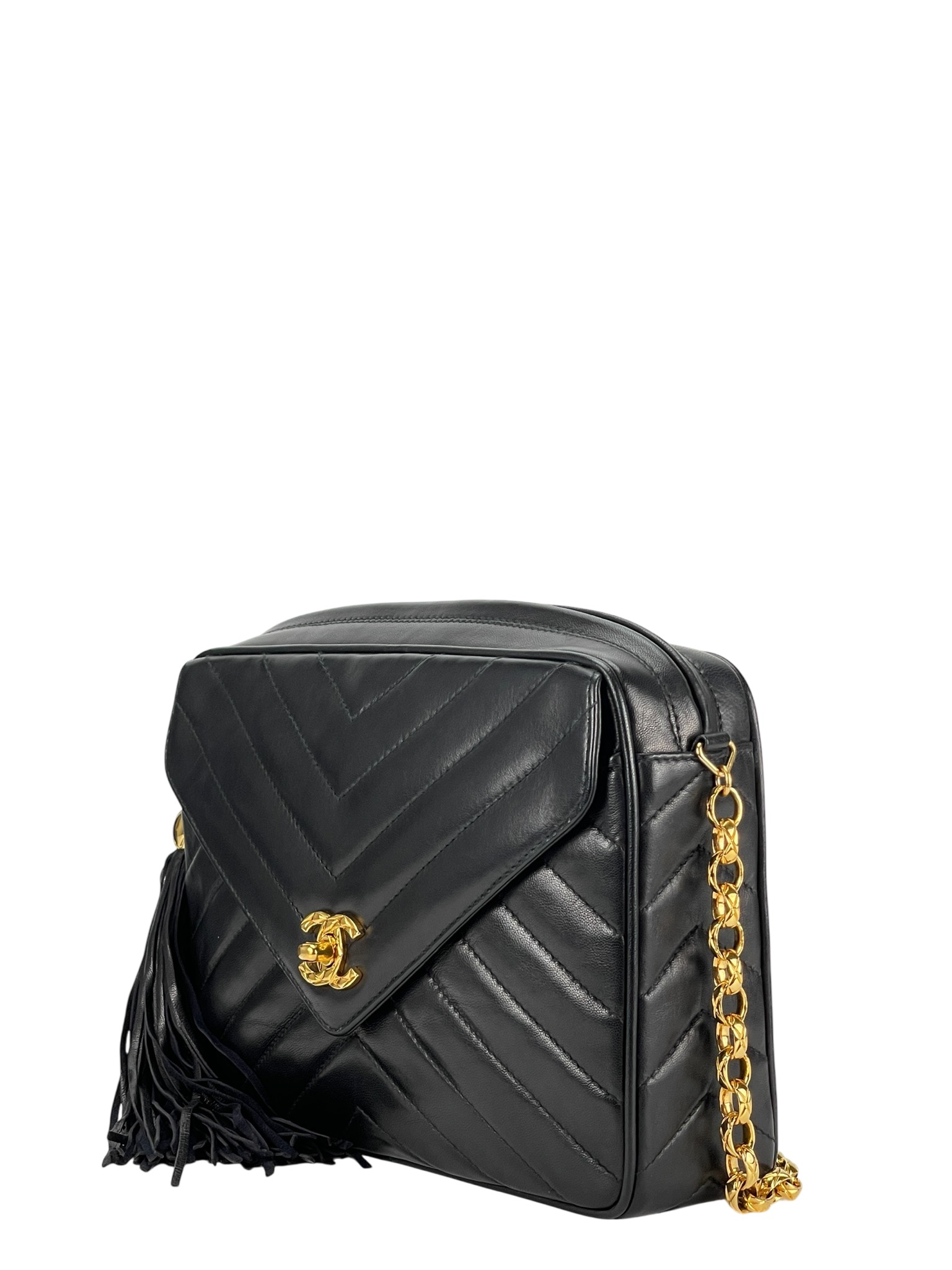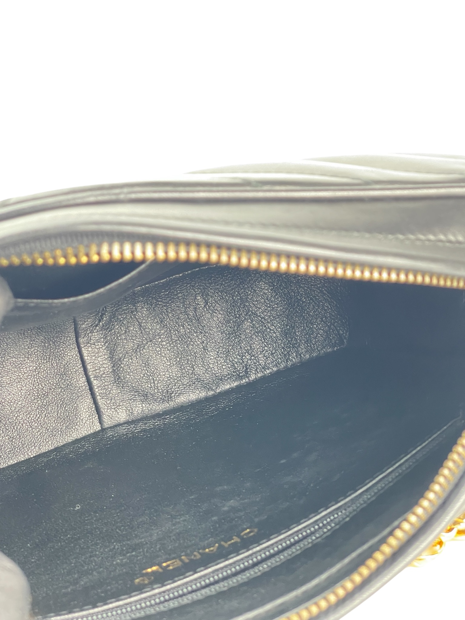 CHANEL – Black Lambskin Chevron Camera Crossbody Bag