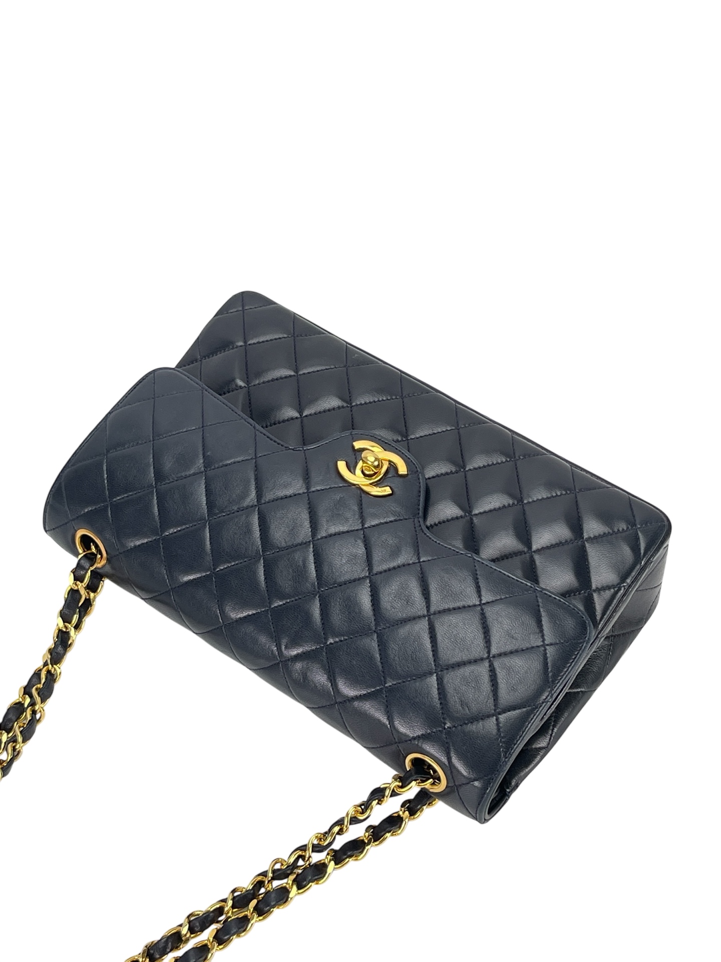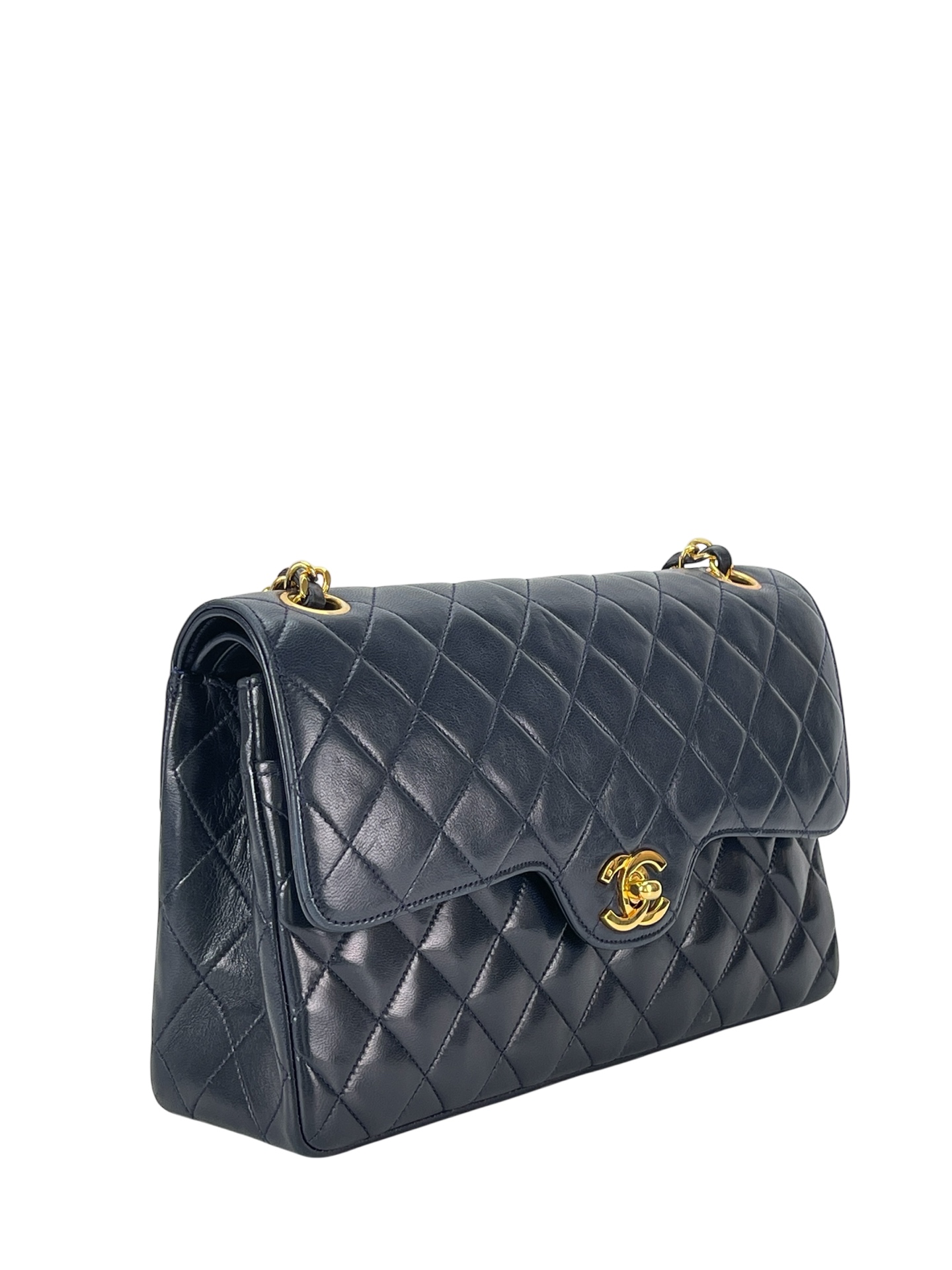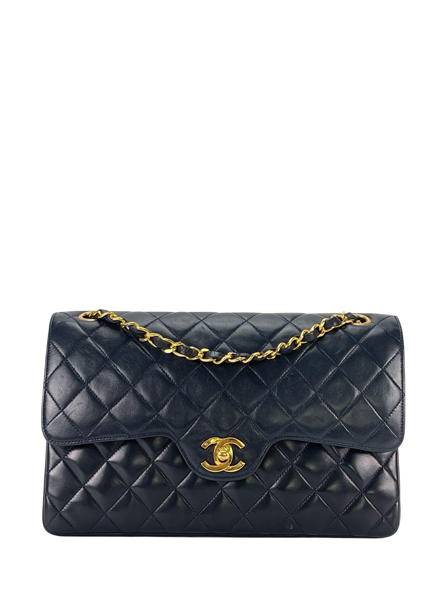 CHANEL – Navy Lambskin Matelasse Double Flap Chain Shoulder Bag